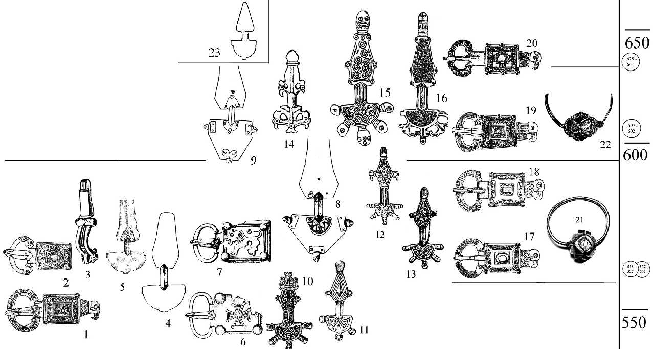Таким образом, материалы из сууксинских погребальных комплексов с наиболее ранними находками днепровских пальчатых фибул, которые мы отнесли ко второму этапу функционирования могильника, по нашим данным следует датировать временем не позднее первой четверти VII в. Хотя не исключено, что изготовление некоторых вещей – других хронологических индикаторов второго этапа, в частности, орлиноголовых пряжек группы Б и составных двупластинчатых фибул, могло начаться в Крыму и чуть раньше – еще в конце VI в. (Засецкая, 2005. С. 67; Шаблавина, 2005. С. 115; Гавритухин, Обломский, 1996. С. 91). Однако, ранние погребальные комплексы с пальчатыми фибулами относятся скорее всего к заключительной фазе второго этапа.