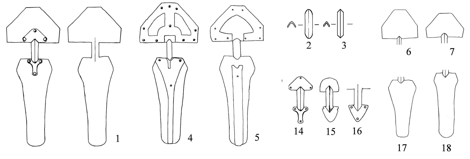 1 — цельнокованные фибулы, 2 — дужка округлая в сечении, 3 — дужка граненая в сечении, 4 — каркас жесткий, 5 — каркас полужесткий, 6 — головка высокая (соотношение ширины к высоте — менее 1,31), 7 — головка приземистая (соотношение ширины к высоте 1,34-1,49), 8 — отношение ширины к длине 0,39-0,44; 9 — отношение ширины к длине 0,36-0,38; 10 — высота головки по отношению к общей длине — 26-27%; 11 — высота головки по отношению к общей длине — 29-32 %; 12 — общая длина менее 18,5 см; 13 — общая длина от 20 см и более; 14 — литые основания дужек (у составных); 15 — обрезанные основания дужек (у составных); 16 — нижнее треугольное основание дужки; 17 — ножка широкая (соотношение длины к максимальному расширению 2,25-2,33); 18 — ножка узкая (соотношение длины к максимальному расширению 2,42-2,61).