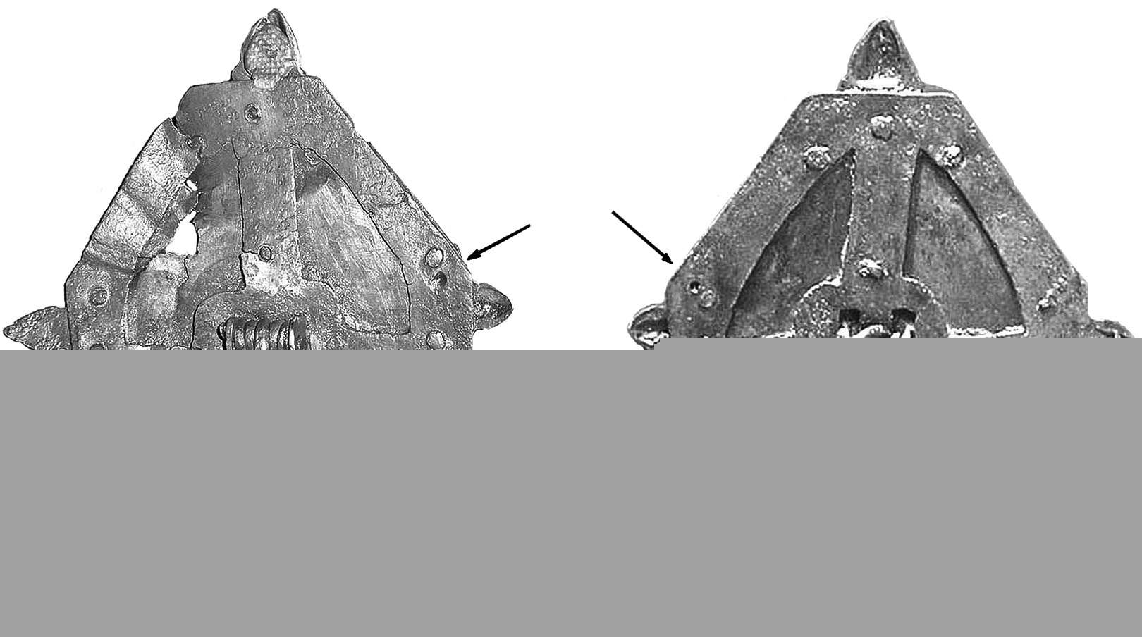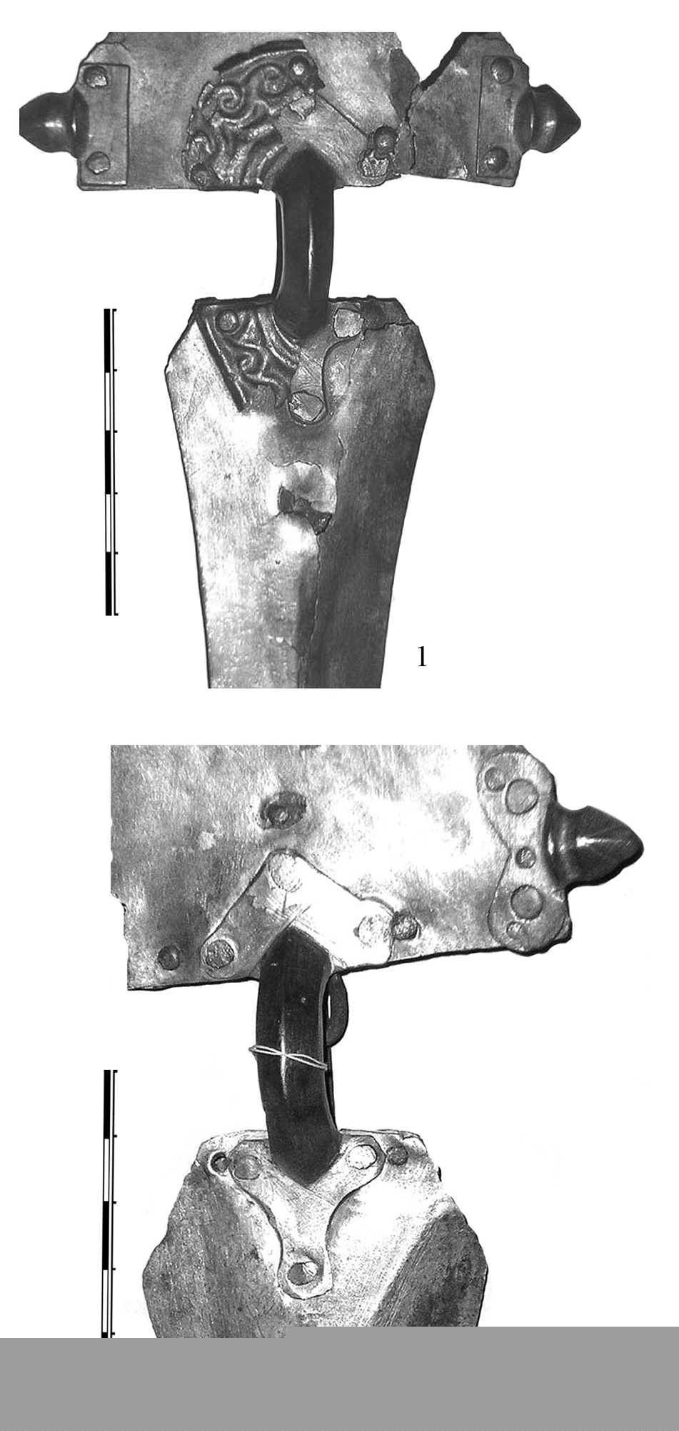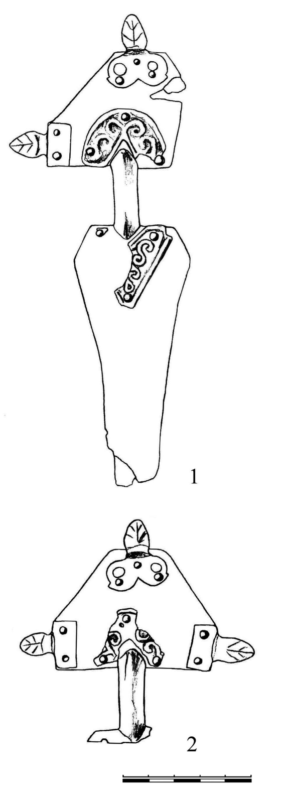 Две фибулы, конструктивно отличные от парных себе (кат. №4б и 11б), которые по формальному признаку должны были бы войти в группу составных, в отличие от них, состоят только из двух основных частей — пластина ножки приклепана к дужке, составляющей одно целое с верхней пластиной-головкой (рис. 8: 2). То, что они конструктивно отличаются от парных себе, заслуживает особого объяснения. Мы рассмотрим их отдельно чуть ниже.