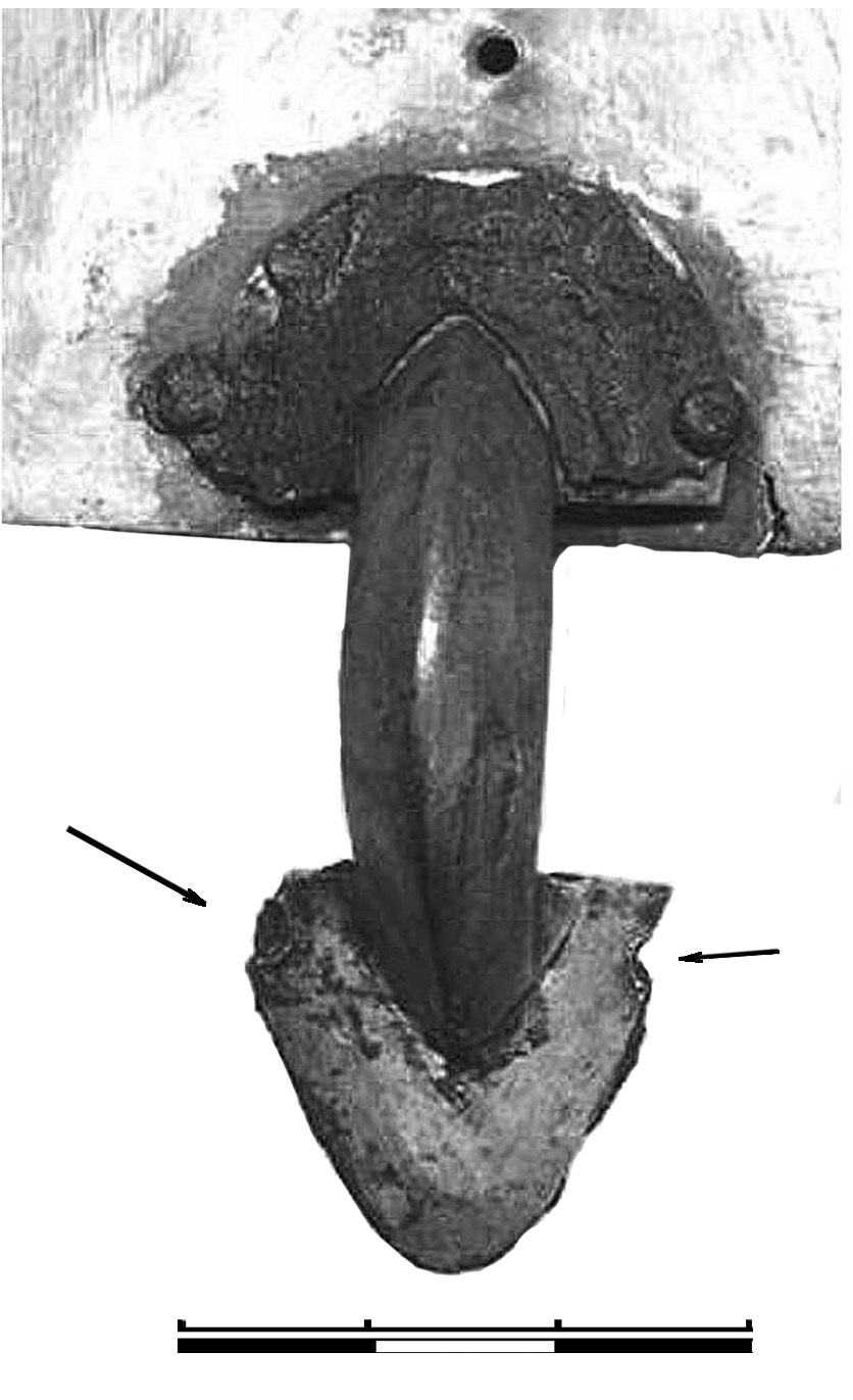 Ножка с иглоприемником не имеет обычного выреза в месте крепления дужки, у нее прямой верхний край. Дужка с головкой приклепаны тремя заклепками, которые на обороте не видны под каркасом. Затем приклепана накладка ножки вместе с каркасом. При этом две верхние заклепки пробили и каркас, и новую ножку, и остатки контура старой ножки. Это не могло не создать лишние трудности при пробивании отверстий. Вероятно, это связано со стремлением вписать отверстия крепления накладки в контур каркаса, что, однако, не совсем удалось: одно из отверстий оказалось частично за пределами его контура (рис. 5: 2). Иглоприемник либо припаян непосредственно к пластине ножки, либо вставлен в прорезь — этого не видно под каркасом. На головке для петель крепления оси пружины в каркасе сделан не общий вырез, а две узкие вертикальные прорези. Общая длина — 185 мм.