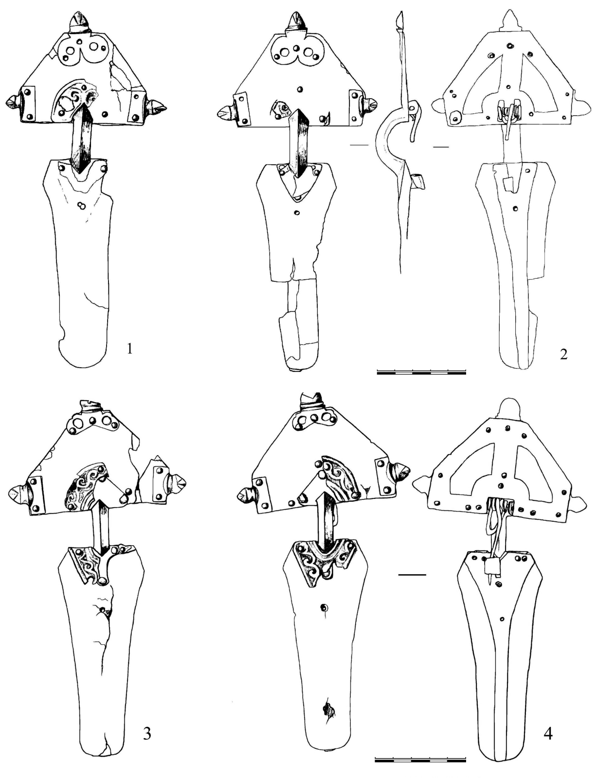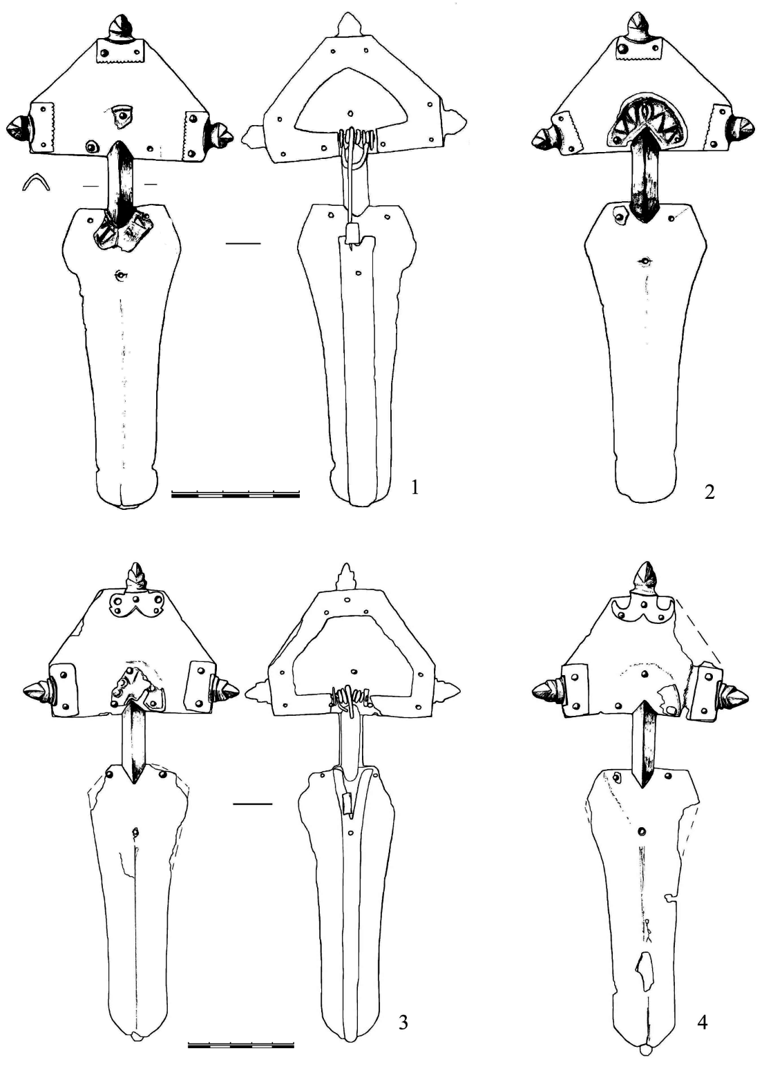 | Рис. 6. Схема эволюции крымских двупластинчатых фибул с накладками. | Рис. 7. Суук-Су. 1,2 — фибулы из погребения 91 (кат. №1); 3, 4 — фибулы из погребения 56-5 (кат. №2). |
