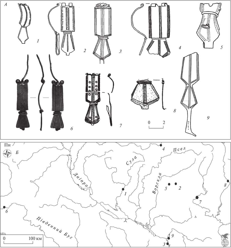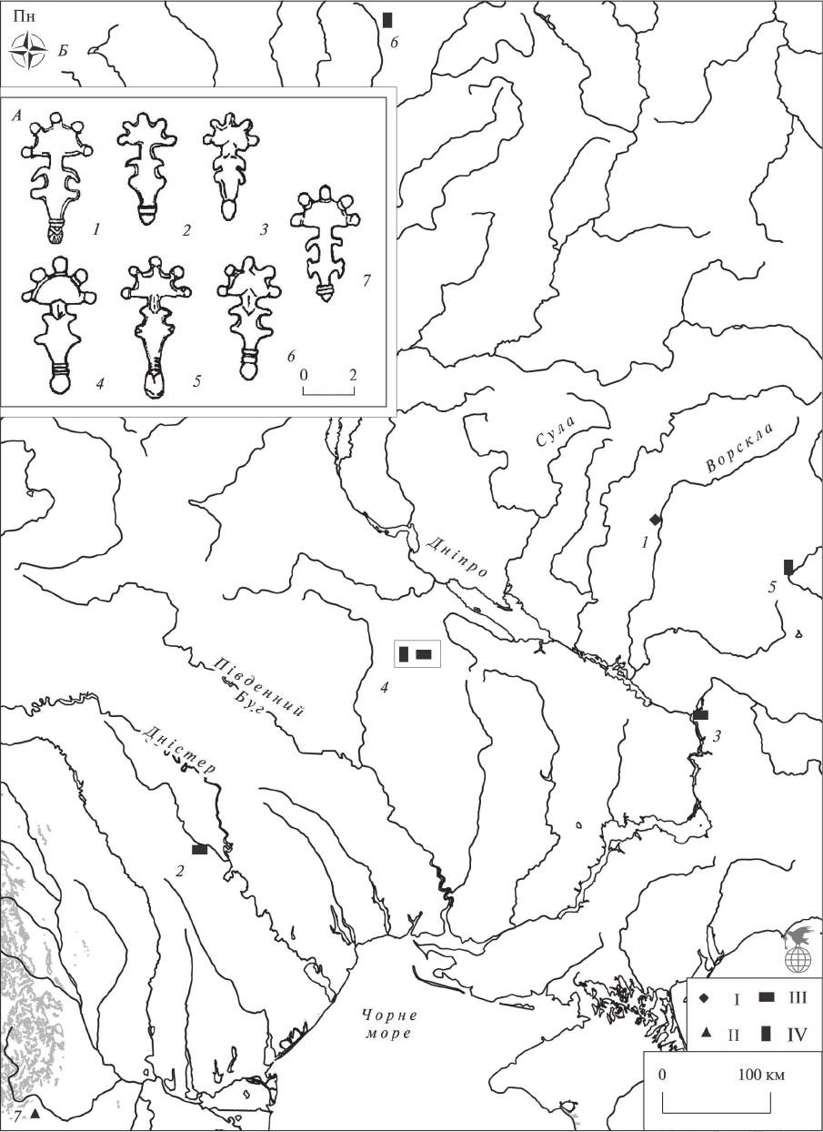 Б. Карта распространения (черным цветом отмечены места находок, которые точно неизвестны): 1 - Малый Вязовок; 2 - Пастырское городище; 3 - Тростянец; 4 - Дежки; 5 - Тымченки (уроч. Таранцева) 6 - Любовка; 7 - район Черкасского уезда; 8 - юг Киевской губернии; 9 - Стеблев; 10 - Кочетокський могильник (уроч. Сороков овраг) 11 - района Чигиринского уезда