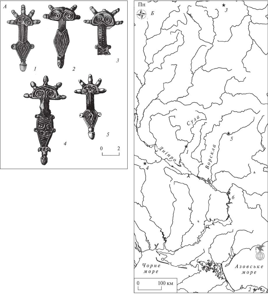 Картографирования указывает на то, что большинство находок таких фибул концентрируется в одном регионе – Среднем Поднепровье (рис. 3, Б). Хотя находки из Малого Вязовка, Любовки и др. свидетельствует о распространении этих фибул и на Левобережье. Возможно, это явление связано с миграцией незначительной части жителей Пастырского городища или вследствие торгово-обменных отношений. Подтверждением таких связей могут служить находки гончарной посуды пастырского типа (Володарець-Урбанович 2010, с. 71-72; Володарець-Урбанович, Скиба 2011, с. 34-46).