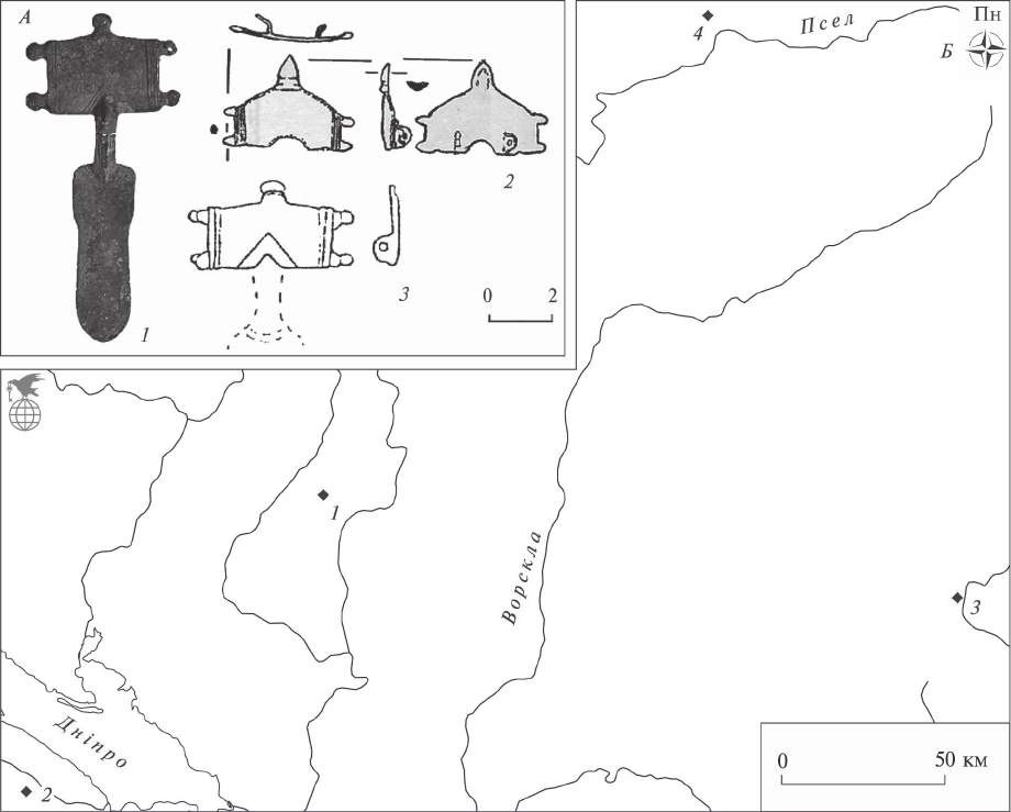 В Среднем Поднепровье и Днепровском Левобережье подобные изделия обнаружены на поселении Новоселица (Приходнюк, Петраускас 1999, с. 178-180, рис. 4, 22) и в составе клада Суджа-Замостье (2 экз.) (Кашкин, Родинкова 2010, рис. 5, рис. 11)5.