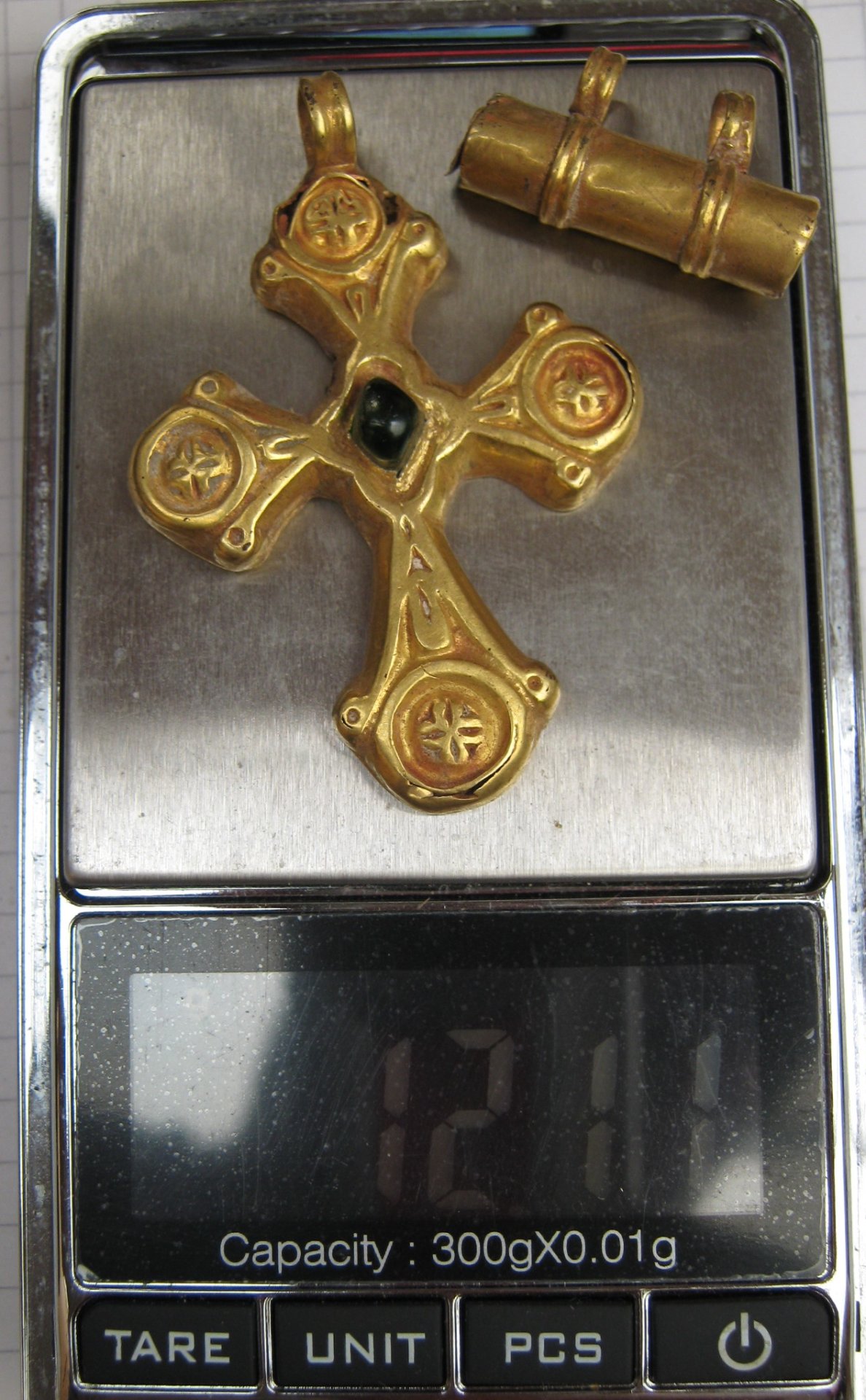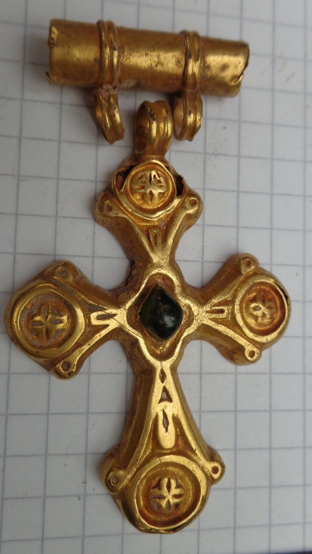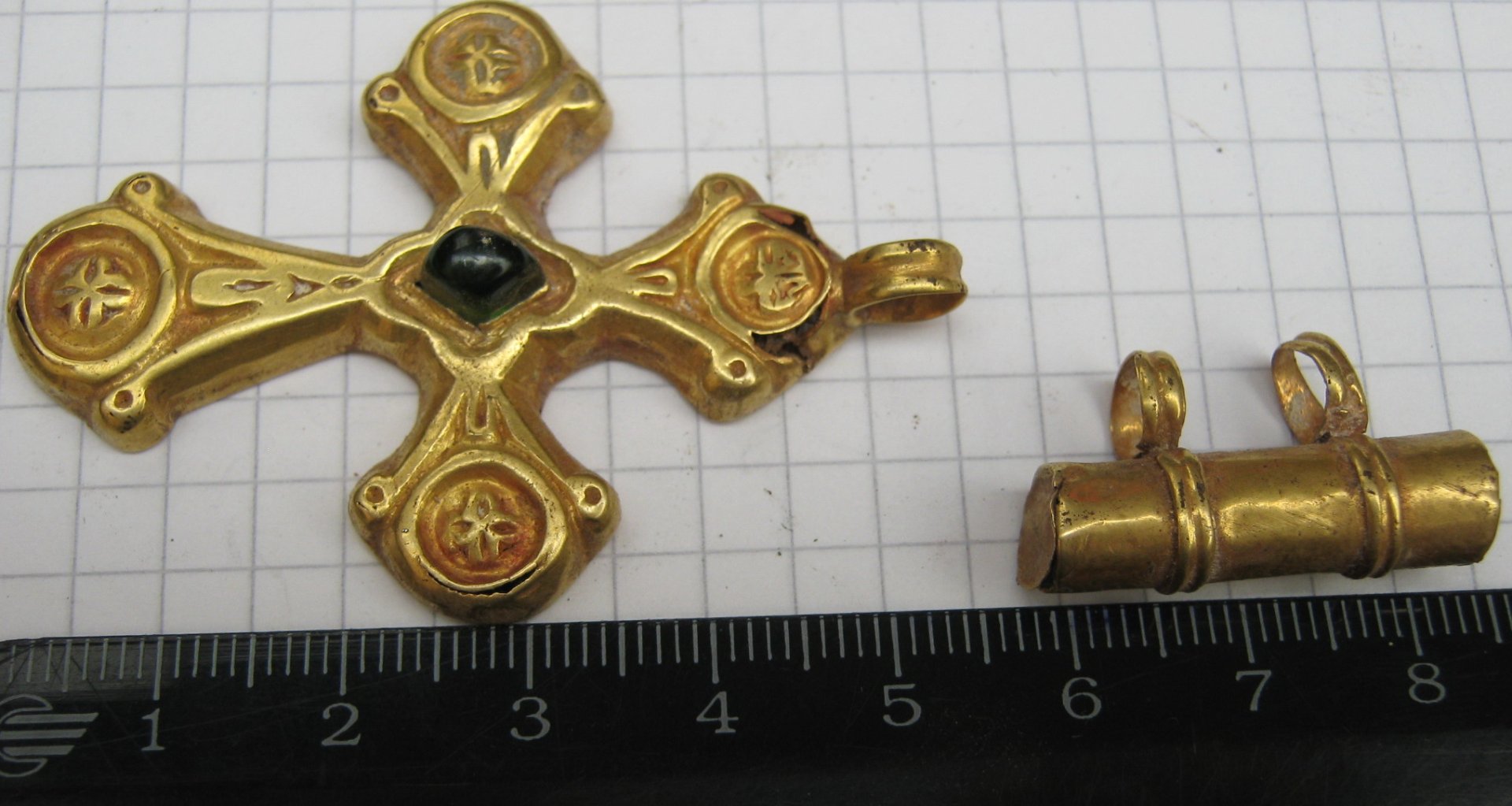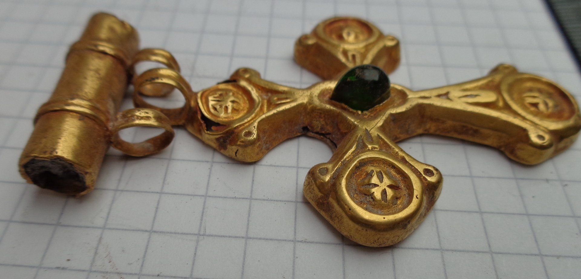 Золотой крест с отдельной от него золотой трубкой представил на Домонгол искатель Алексей2010. По словам искателя крест полый внутри, что в общем видно по фото, а регион находки Крым. Вероятнее всего, золотая трубка служило задней застежкой-противовесом нагрудной цепи на которой носился этот крест. В Крыму известен пример подобной находки на скелете 6 в погребальной камере 257 из Ески Кермен (по Айбабин 1982). Также известен подоббный крест VII-VIII вв. из погребения у с. Гладковка (Келегейские хутора), Херсонская область. Раскопки 1927 г.