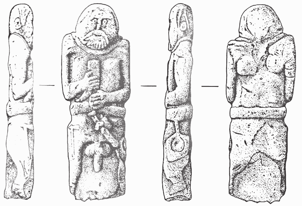 Во-вторых, боевые топоры в некоторых случаях изображены подвешенными к поясу на скифских антропоморфных статуях, которые по убедительному мнению М.И. Артамонова [1, c. 79], представляют собой воплощенный в камне образ героя-родоначальника. Например, именно топор изображен на известной каменной статуи с Нововасильевки (рис. 1). Не случайно, как свидетельствует Геродот [IV, 70], при заключении клятвенного соглашения скифы, которые договаривались, погружали в чашу, где были смешанная их кровь и вино, оружие, среди которой была и топор. Таким образом, топор будто освящал соглашение.