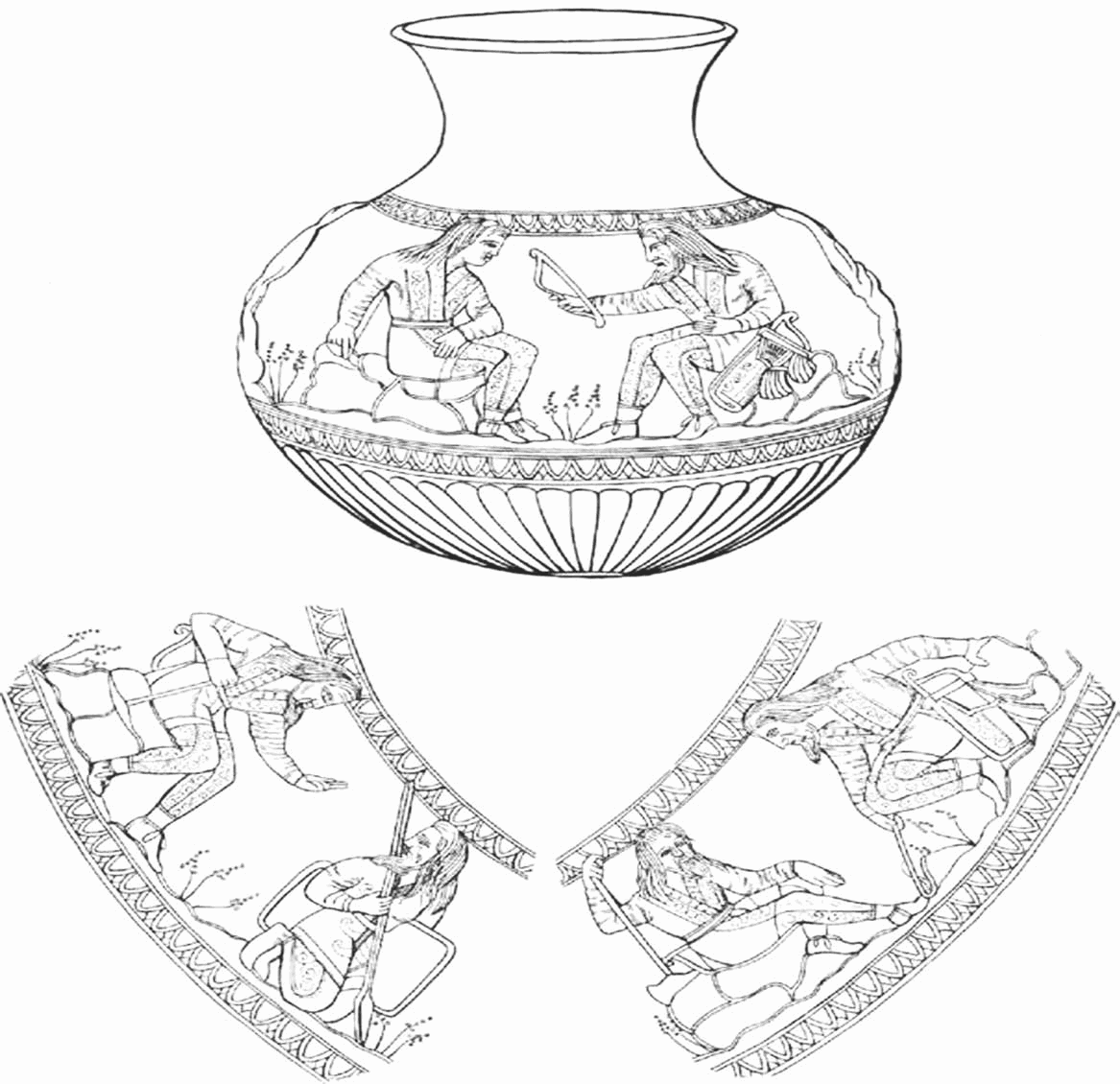 В-третьих, на предметах греческой торевтики, которые найденные в богатых памятниках скифского времени Восточной Европы, топоры изображены в руках воинов, вероятно аристократов. Прежде всего, это изображение на серебряном бокале с Частых курганов, близ Воронежа (Рис. 2).