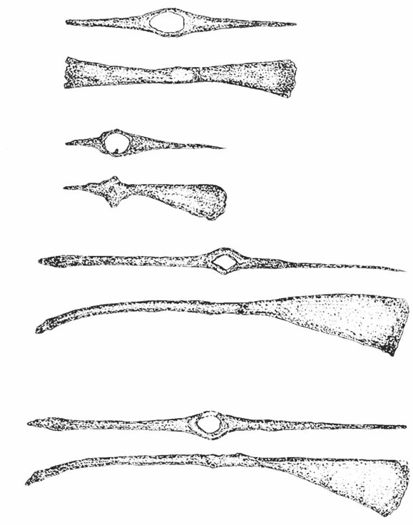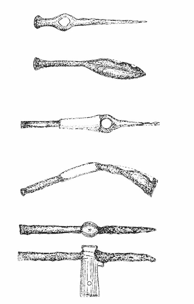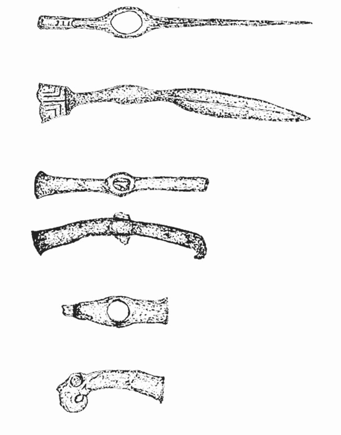 Рассмотрим сначала древнейшие из них. Безусловно, к их числу относится, прежде всего, биметаллический клевец (рис. 4, 1, 9). Его железная боевая часть длиной 22 см, состоящпя из киркоподобного клинка и молотковидного обуха, соединенная с бронзовой втулкой, нижнее отверстие которой равна 28 мм. Во втулке имеется небольшое отверстие, обеспечивающие надежное крепление клевца к деревянной рукоятке с помощью какого-то металлического стержня.