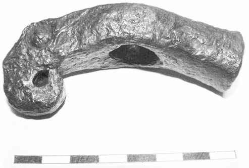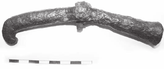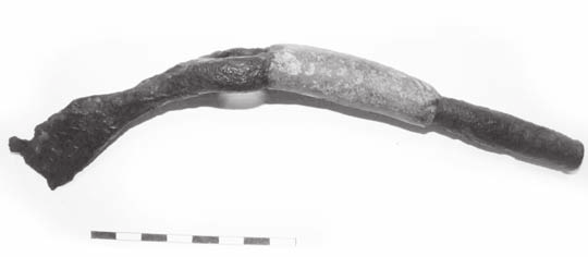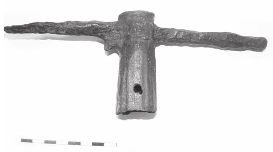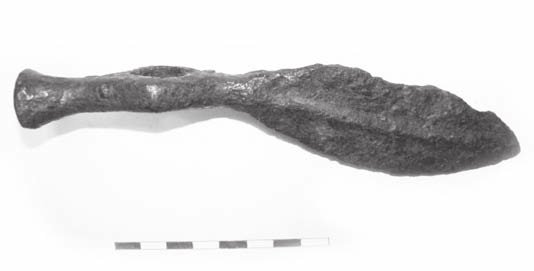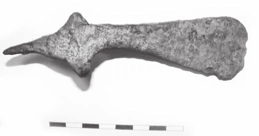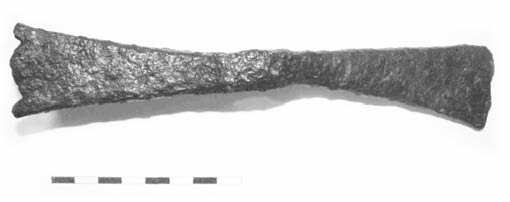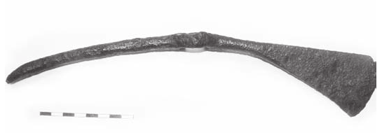 Еще одно изделие относится к категории топоров-молотков. По В.А. Иллинской30, они являются основным типом скифских боевых железных топоров. Исследовательница разделила их на три типа: дуговидно изогнутые; с прямой спинкой и с лопастью, симметрично расширяется к лезвию.