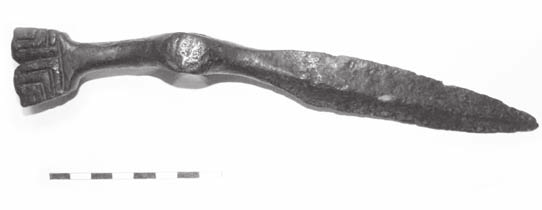 Уникальным является клевец (длина 237 мм), который имеет также кинджалоподобный, немного изогнутый клинок и обух в виде молотка. На окончании обух имеет расширение, украшенное геометрическим орнаментом (рис. 3,3, 7). Близких аналогий ему нам неизвестно, разве что можно слегка сравнить его с уже упоминавшимися клевцами из станицы Гостагаевской и с пос. Большая Таяба, но первый является бронзовым, а последний – биметаллическим, а его геометрическая орнаментация более пышная. Однако это может указывать на довольно раннюю дату (вероятно, в пределах VII - первой половины VI в. До н. э.) клевца из Музея.