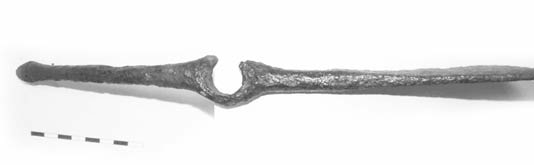 Уникальным для скифских древностей является биметаллический клевец. Он длинный и несколько изогнутый, а обух украшен бронзовой обоймой, верхняя часть которой выполнена в виде головы человека. Не вызывает сомнения, что данный клювець имел сакральное значение и был символом власти.