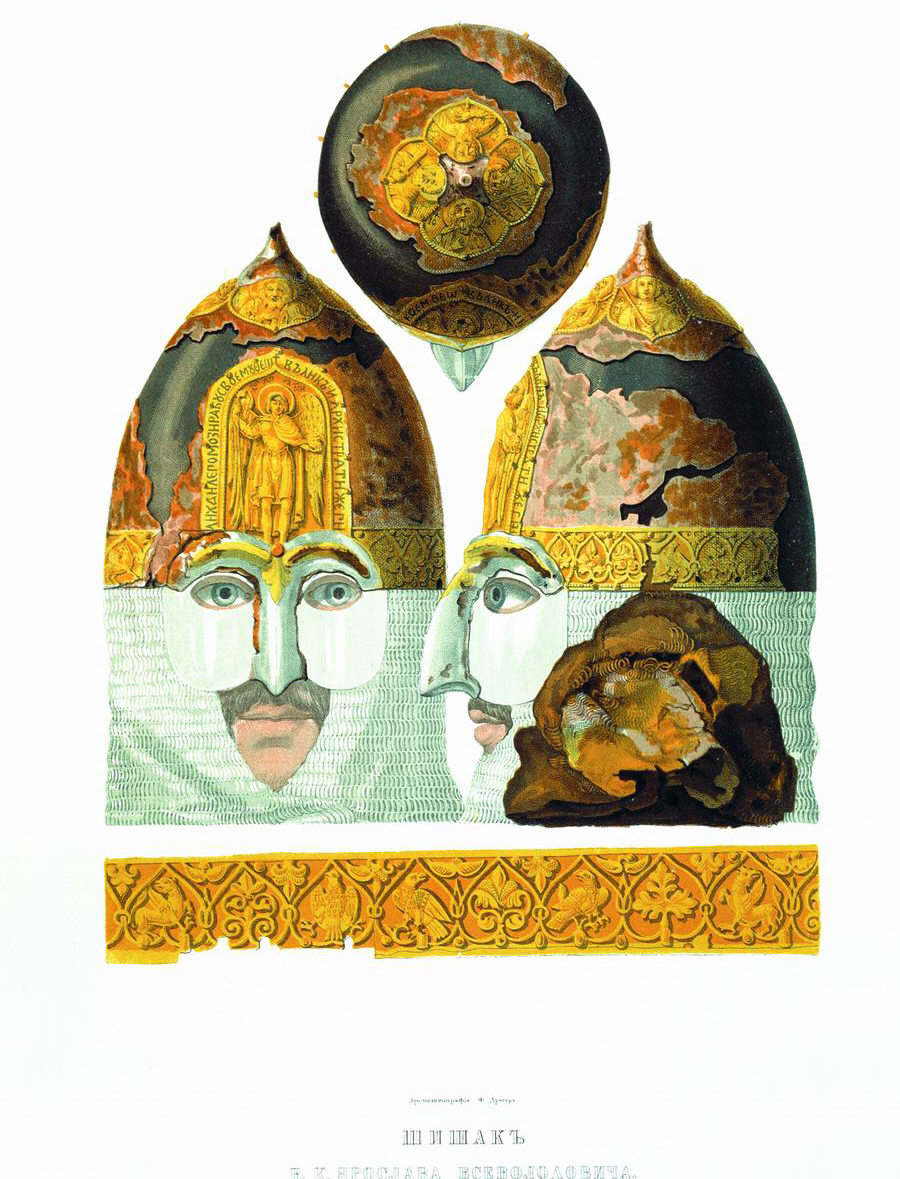 Домонгольское русское происхождение крутобоких золоченых шлемов доказывается датировками двух находок — так называемого «шлема Ярослава Всеволодовича» и полумаски из Вщижа. Однако в обоих этих случаях датировка более чем спорна. Особенно это касается находки у села Лыково. Этот шлем был найден в двадцати верстах от поля битвы при Липице по дороге во Владимир. Данный факт позволил президенту Академии художеств Алексею Николаевичу Оленину предположить, что он мог принадлежать князю Ярославу Всеволодовичу, бросившему его во время бегства77. В пользу этой версии могло бы свидетельствовать крестильное имя Ярослава — Федор, действительно содержащееся в благожелательной надписи на челе шлема: «Вьликъй архистратиже ги Михаиле помози рабу своему Феодору». И правда, летопись свидетельствует, что после битвы при Липице братья Ярослав и Юрий Всеволодовичи бежали. Но побежали они разными дорогами. Ярослав побежал в Переяславль, а во Владимир сбежал Юрий. Следовательно, более логично было предположить, что шлем мог бросить по дороге во Владимир только Юрий, тем более, именно о нем летопись говорит как о сбросившем всю верхнюю одежду во время бегства78. Впрочем, в Новгородской первой летописи, где читается исходный текст «Повести о битве на Липице»79, этой детали нет. Поэтому она может быть результатом творчества летописца XV в.80