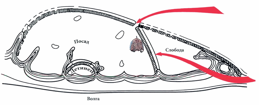 Рис. 54. Гипотетическая реконструкция взятия Городца войсками Едигея в 1408 году и место находки шлема на месте боя (рисунок А.Е. Негина)