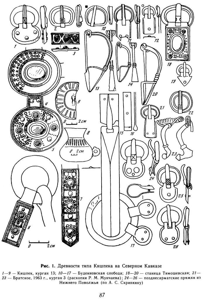 Рис. 1. Древности типа Кишпека на Северном Кавказе. 1-9 — Кишпек, курган 13; 10-17 — Будённовская слобода; 18-20 — станица Тимошевская; 21-23 — Братское, 1963 г., курган 3 (раскопки Р.М. Мунчаева); 24-26 — позднесарматские пряжки из Нижнего Поволжья (по А.С. Скрипкину).