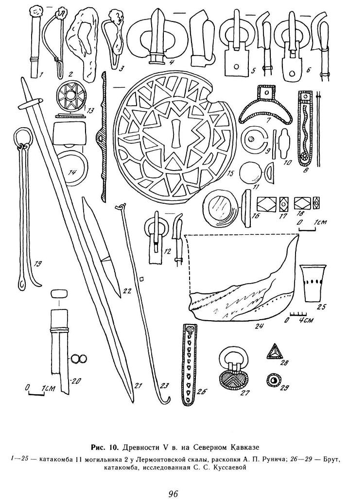 Рис. 10. Древности V в. на Северном Кавказе. 1-25 — катакомба 11 могильника 2 у Лермонтовской скалы, раскопки А.П. Рунича; 26-29 — Брут, катакомба, исследованная С.С. Куссаевой.
