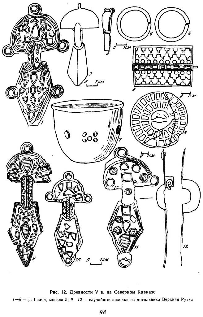 Рис. 12. Древности V в. на Северном Кавказе 1-8 — р. Гиляч, могила 5; 9-12 — случайные находки из могильника Верхняя Рутха.