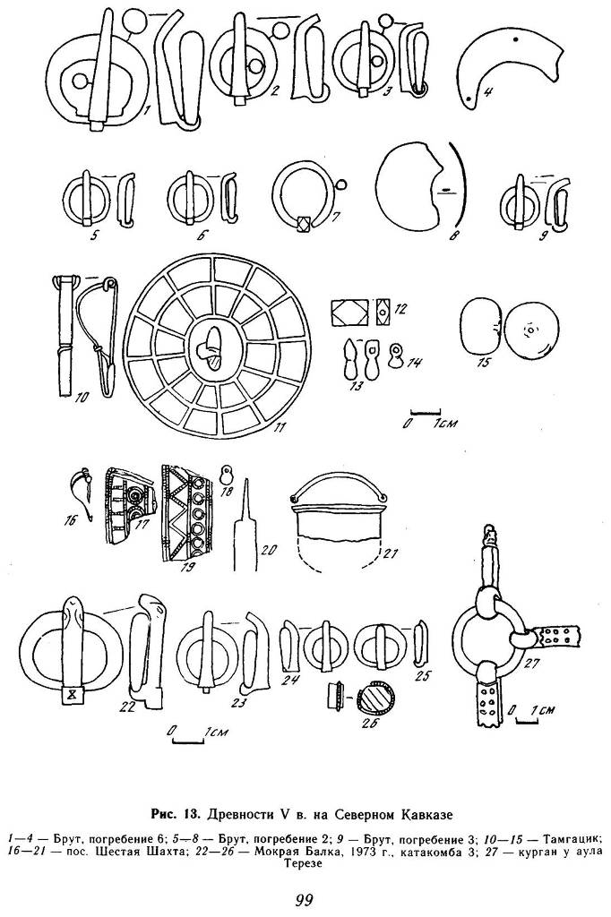 Рис. 13. Древности V в. на Северном Кавказе. 1-4 — Брут, погребение 6; 5-8 — Брут, погребение 2; 9 — Брут, погребение 3; 10-15 — Тамгацик; 16-21 — пос. Шестая Шахта; 22-26— Мокрая Балка, 1973 г., катакомба 3; 27 — курган у аула Терезе.