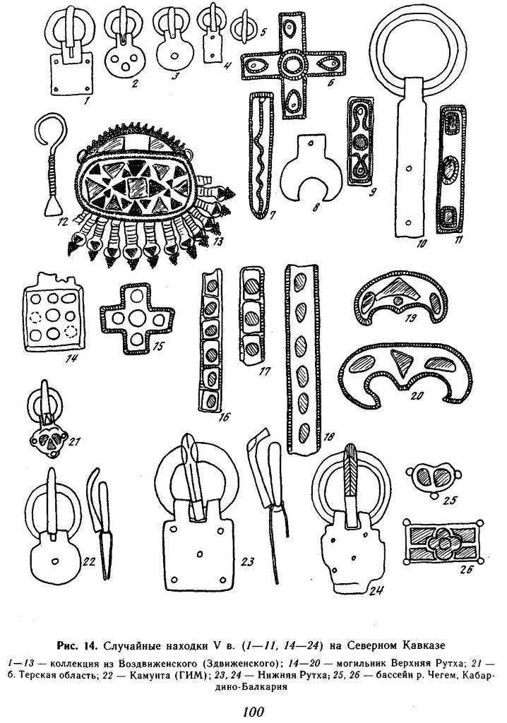 Рис. 14. Случайные находки V в. (1-11, 14-24) на Северном Кавказе. 1-13 — коллекция из Воздвиженского (Здвиженского); 14-20 — могильник Верхняя Рутха; 21 — б. Терская область; 22 — Камунта (ГИМ); 23, 24 — Нижняя Рутха, 25, 26 — бассейн р. Чегем, Кабардино-Балкария.