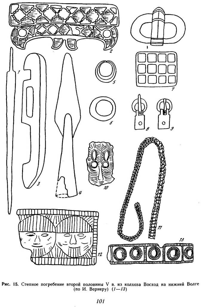 Рис. 15. Степное погребение второй половины V в. из колхоза Восход на нижней Волге (по И. Вернеру) (1-13).