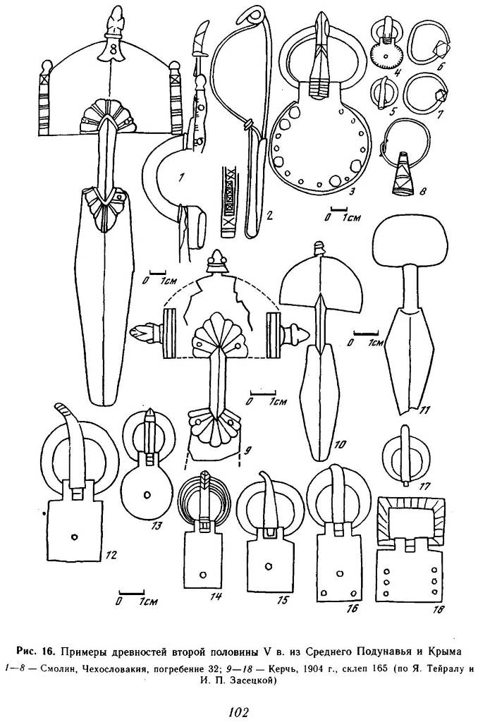 Рис. 16. Примеры древностей второй половины V в. из Среднего Подунавья и Крыма. 1-8 — Смолин, Чехословакия, погребение 32; 9-18 — Керчь, 1904 г., склеп 165 (по Я. Тейралу и И.П. Засецкой).