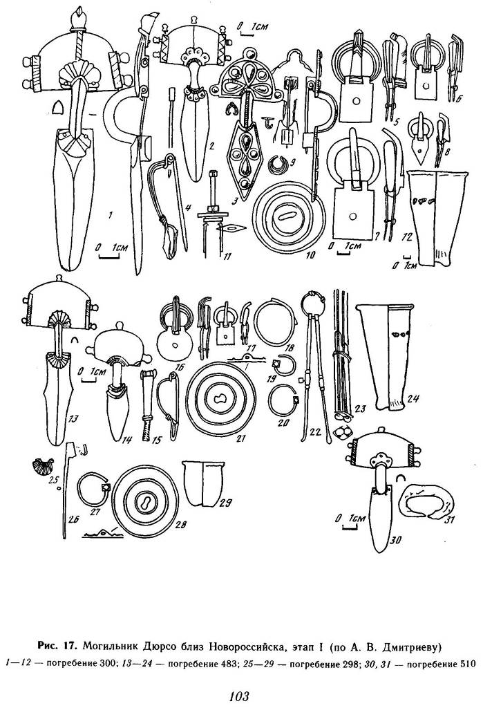 Рис. 17. Могильник Дюрсо близ Новороссийска, этап I (по А.В. Дмитриеву) 1-12 — погребение 300; 13-24 — погребение 483; 25-29 — погребение 298; 30, 31 — погребение 510.