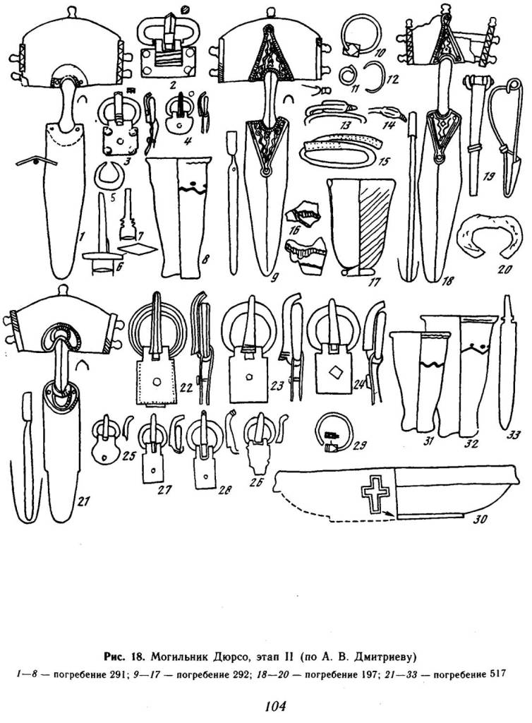 Рис. 18. Могильник Дюрсо, этап II (по А.В. Дмитриеву). 1-8 — погребение 291; 9-17 — погребение 292; 18-20 — погребение 197; 21-33 — погребение 517.