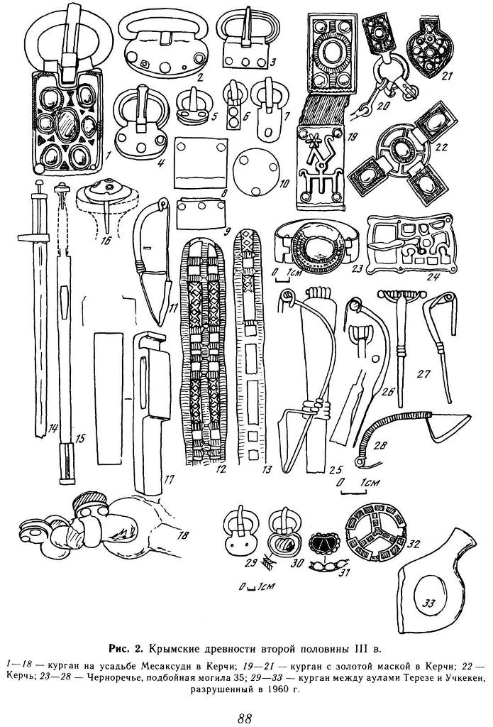 Рис. 2. Крымские древности второй половины III в. 1-18 — курган на усадьбе Месаксуди в Керчи; 19-21 — курган с золотой маской в Керчи; 22 -Керчь; 23-28 — Черноречье, подбойная могила 35; 29-33 — курган между аулами Терезе и Учкекен, разрушенный в 1960 г.