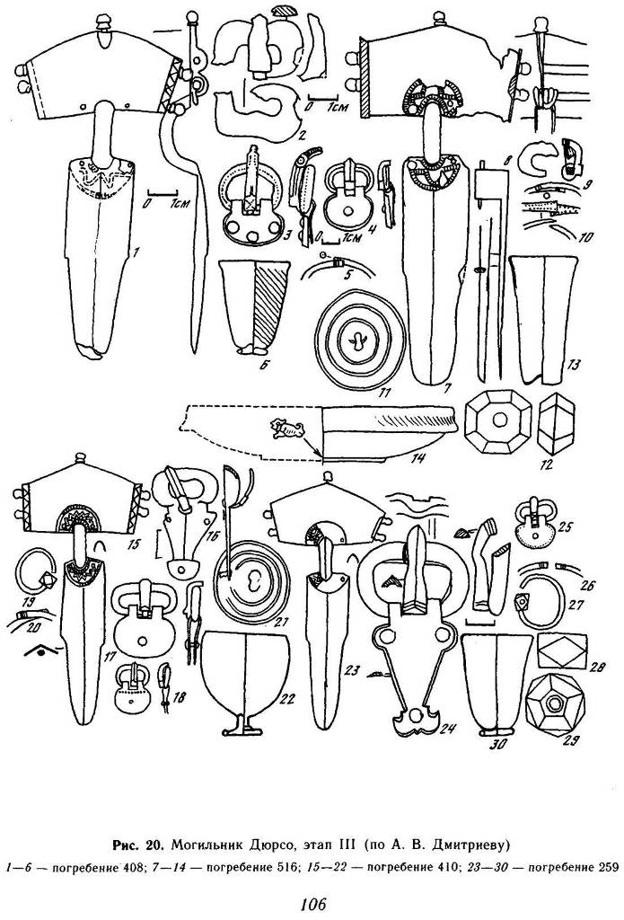 Рис. 20. Могильник Дюрсо, этап III (по А.В. Дмитриеву). 1-6 — погребение 408; 7-14 — погребение 516; 15-22 — погребение 410; 23-30 — погребение 259.