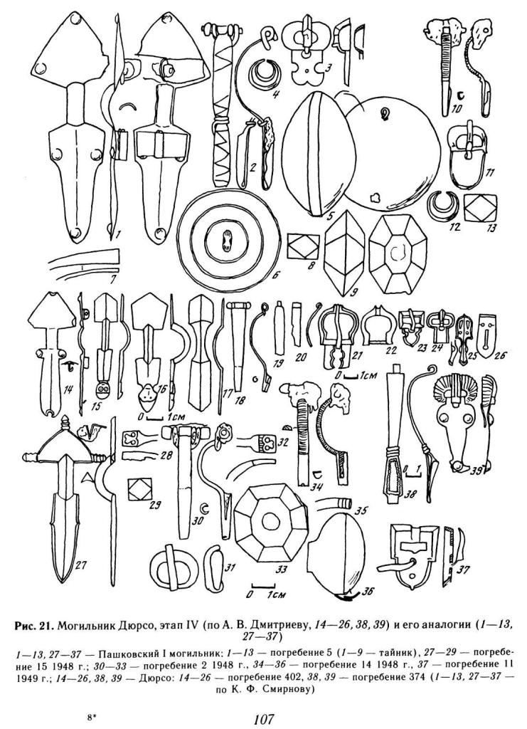 Рис. 21. Могильник Дюрсо, этап IV (по А.В. Дмитриеву, 14-26, 38, 39) и его аналогии (1-13, 27-37). 1-13, 27-37 — Пашковский I могильник: 1-13 — погребение 5 (1-9 — тайник), 27-29 — погребение 15 1948 г.; 30-33 — погребение 2 1948 г., 34-36 — погребение 14 1948 г., 37 — погребение 11 1949 г.; 14-26, 38, 39 — Дюрсо: 14-26 — погребение 402, 38, 39 — огребение 374 (1-13, 27-37 — по К.Ф. Смирнову).