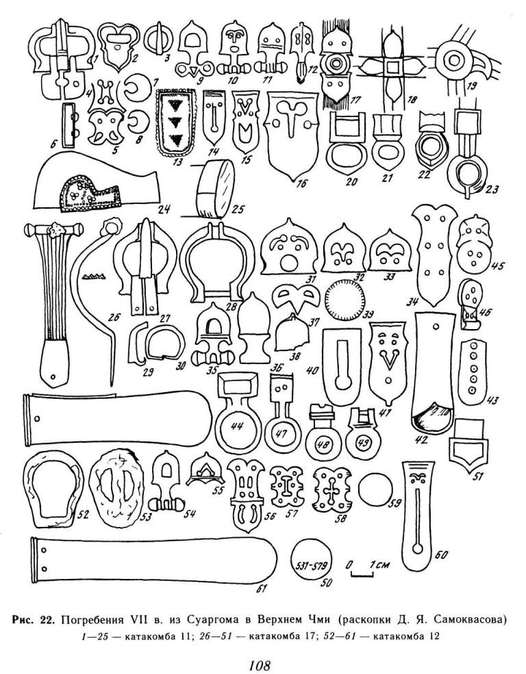 Рис. 22. Погребения VII в. из Суаргома в Верхнем Чми (раскопки Д.Я. Самоквасова) 1-25 — катакомба 11; 26-51 — катакомба 17; 52-61 — катакомба 12.