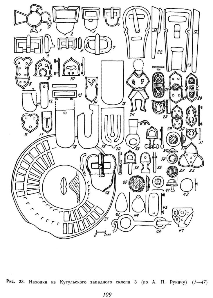 Рис. 23. Находки из Кугульского западного склепа 3 (по А.П. Руничу) (1-47).