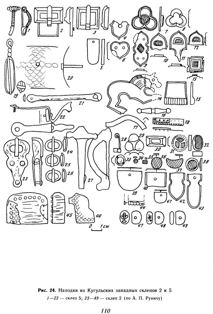 Рис. 24. Находки из Кугульских западных склепов 2 и 5. 1-22 — склеп 5; 23-49 — склеп 2 (по А.П. Руничу).