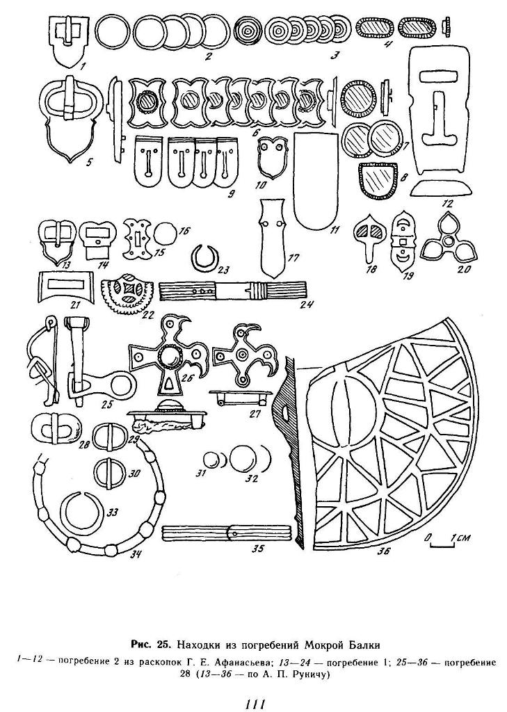 Рис. 25. Находки из погребений Мокрой Балки. 1-12 — погребение 2 из раскопок Г.Е. Афанасьева; 13-24 —погребение 1; 25-36 — погребение 28 (13-36 — по А.П. Руничу).