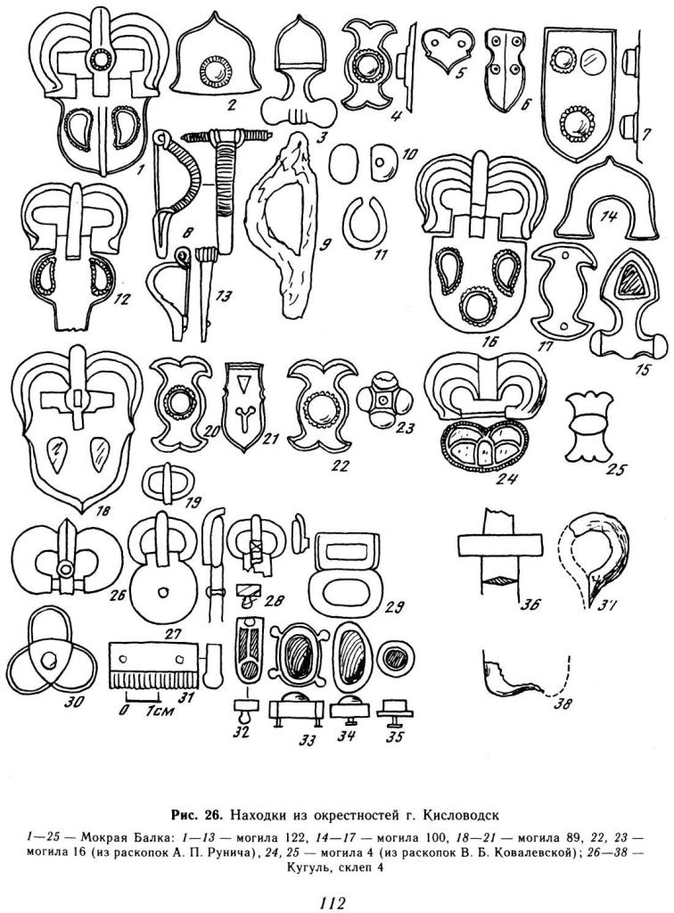 Рис. 26. Находки из окрестностей г. Кисловодск. 1-25 — Мокрая Балка: 1-13 — могила 122, 14-17 — могила 100, 18-21 — могила 89, 22, 23 — могила 16 (из раскопок А.П. Рунича), 24, 25 — могила 4 (из раскопок В.Б. Ковалевской); 26-38 — Кугуль, склеп 4.