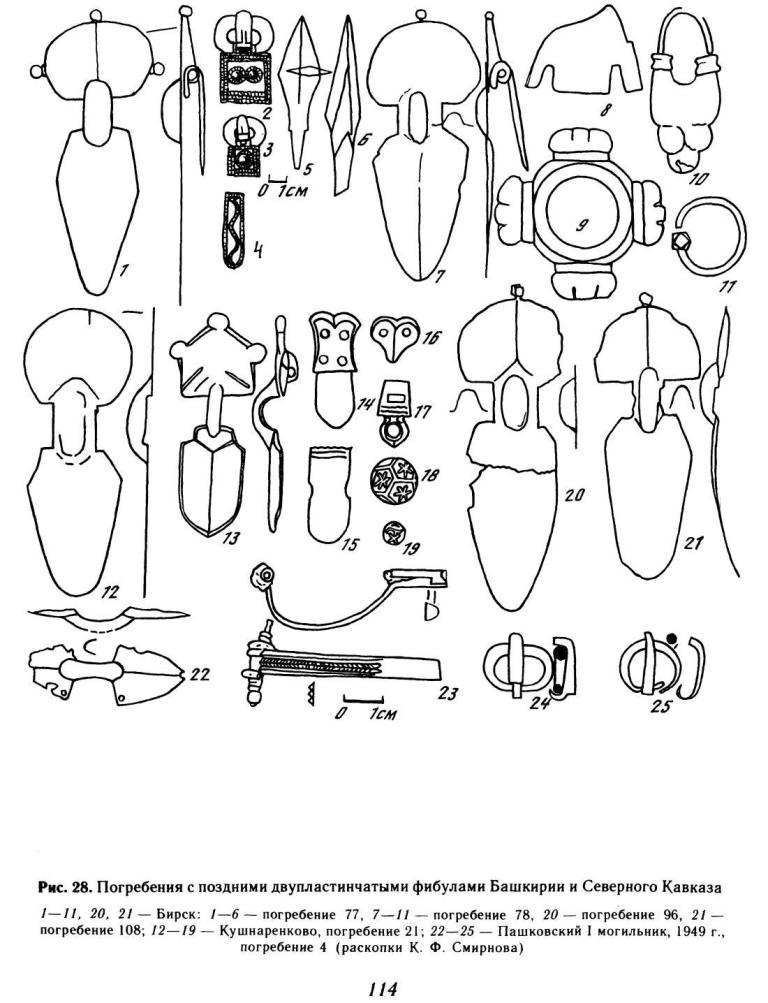 Рис. 28. Погребения с поздними двупластинчатыми фибулами Башкирии и Северного Кавказа. 1-11, 20, 21 — Бирск: 1-6 — погребение 77, 7-11 — погребение 78, 20 — погребение 96, 21 — погребение 108; 12-19 — Кушнаренково, погребение 21; 22-25 — Пашковский I могильник, 1949 г., погребение 4 (раскопки К.Ф. Смирнова).