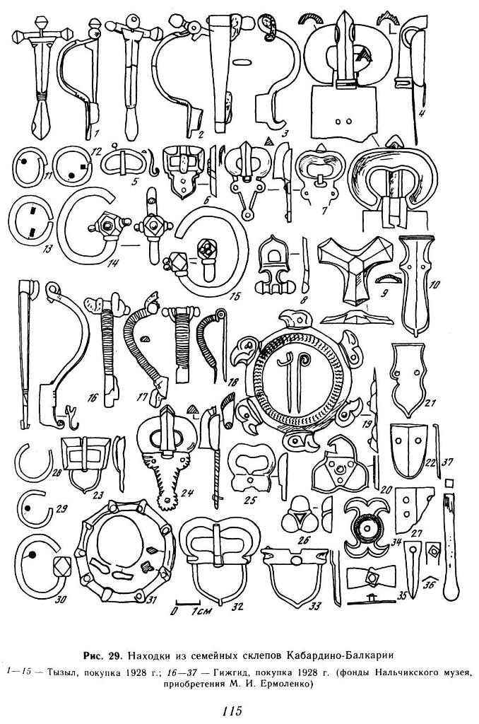 Рис. 29. Находки из семейных склепов Кабардино-Балкарии. 1-15 — Тызыл, покупка 1928 г.; 16-37 — Гижгид, покупка 1928 г. (фонды Нальчикского музея, приобретения М.И. Ермоленко).