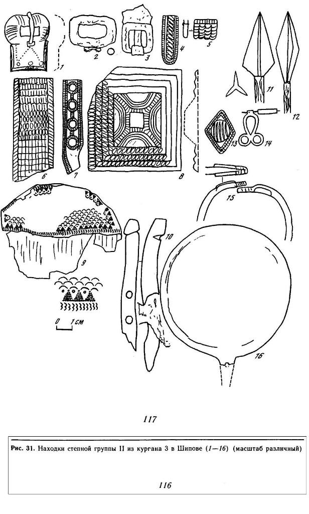 Рис. 31. Находки степной группы II из кургана 3 в Шипове (1-16) (масштаб различный) [подпись: с. 116, рис.: с. 117].