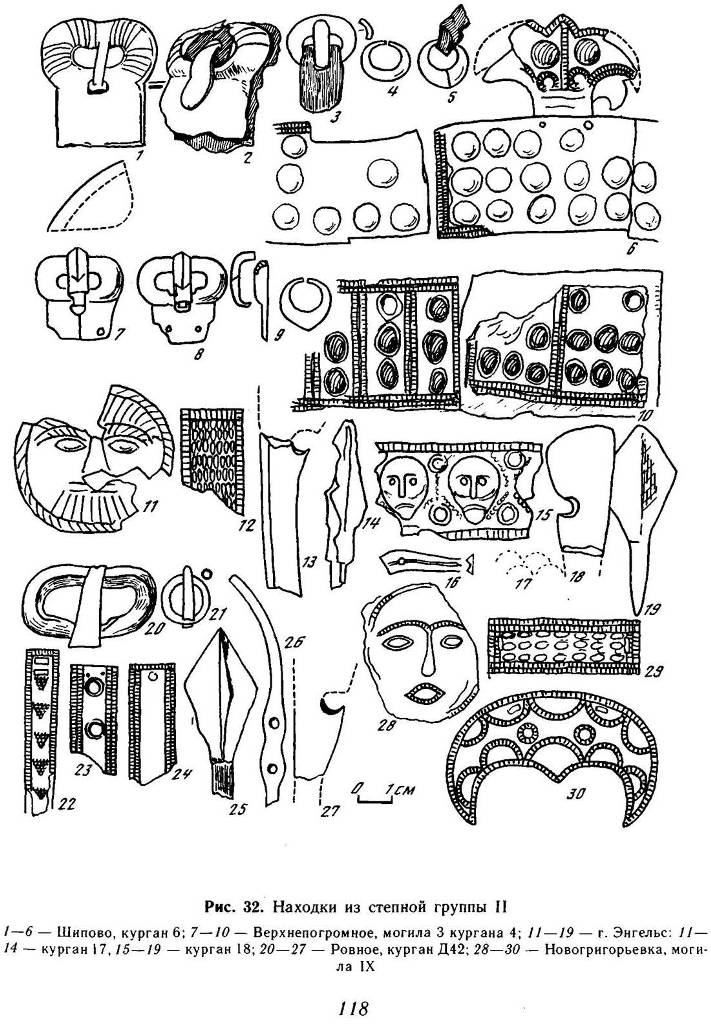Рис. 32. Находки из степной группы II. 1-6 — Шипово, курган 6; 7-10 — Верхнепогромное, могила 3 кургана 4; 11-19 — г. Энгельс: 11-14 — курган 17, 15-19 — курган 18; 20-27 — Ровное, курган Д42; 28-30 — Новогригорьевка, могила IX.