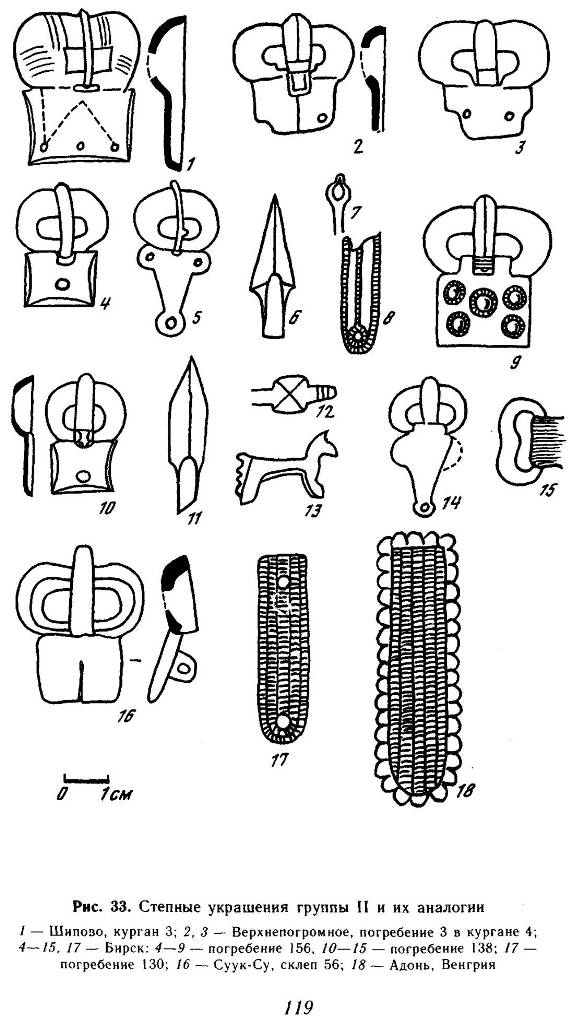 Рис. 33. Степные украшения группы II и их аналогии. 1 — Шипово, курган 3; 2, 3 — Верхнепогромное, погребение 3 в кургане 4; 4-15, 17 — Бирск: 4-9 — погребение 156, 10-15 — погребение 138; 17 — погребение 130; 16 — Суук-Су, склеп 56; 18 — Адонь, Венгрия.