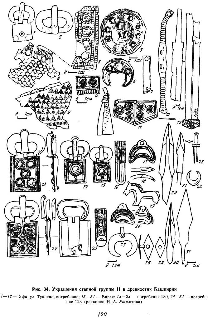 Рис. 34. Украшения степной группы II в древностях Башкирии. 1-12 — Уфа, ул. Тукаева, погребение; 13-31 — Бирск: 13-23 — погребение 130, 24-31 — погребение 123 (раскопки Н.А. Мажитова).