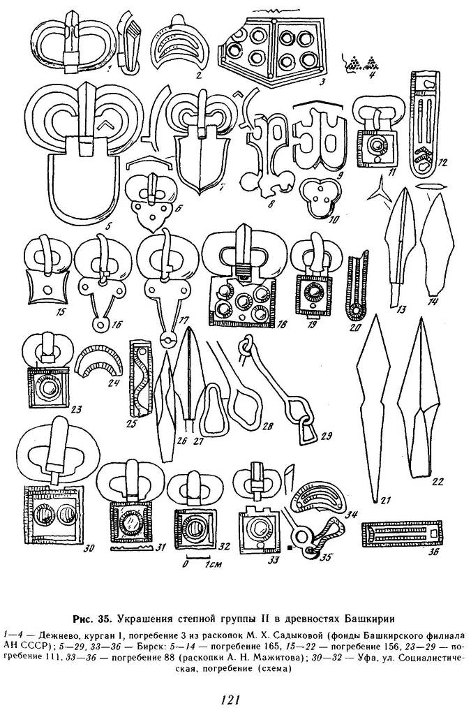Рис. 35. Украшения степной группы II в древностях Башкирии. 1-4 — Дежнево, курган 1, погребение 3 из раскопок М.X. Садыковой (фонды Башкирского филиала АН СССР); 5-29, 33-36 — Бирск: 5-14 — погребение 165, 15-22 — погребение 156, 23-29 — погребение 111, 33-36 — погребение 88 (раскопки А.Н.[надо: Н.А.] Мажитова); 30-32 — Уфа, ул. Социалистическая, погребение (схема).