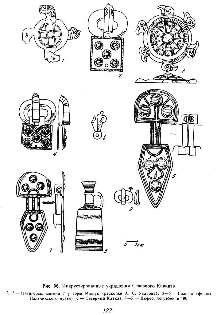 Рис. 36. Инкрустированные украшения Северного Кавказа. 1, 2 — Пятигорск, могила 7 у горы Машук (раскопки А.С. Уварова); 3-5 — Гижгид (фонды Нальчикского музея); 6 — Северный Кавказ; 7-9 — Дюрсо, погребение 490.