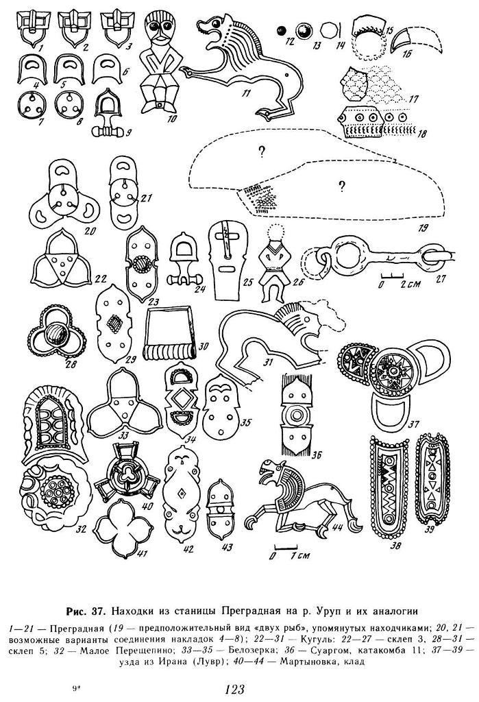 Рис. 37. Находки из станицы Преградная на р. Уруп и их аналогии. 1-21 — Преградная (19 — предположительный вид «двух рыб», упомянутых находчиками; 20, 21 — возможные варианты соединения накладок 4-8); 22-31 — Кугуль: 22-27 — склеп 3, 28-31 — склеп 5; 32 — Малое Перещепино; 33-35 — Белозерка; 36 — Суаргом, катакомба 11; 37-39 — узда из Ирана (Лувр); 40-44 — Мартыновка, клад.