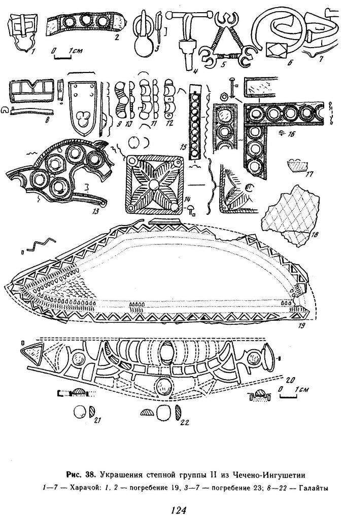 Рис. 38. Украшения степной группы II из Чечено-Ингушетии. 1-7 — Харачой: 1, 2 — погребение 19, 3-7 — погребение 23; 8-22 — Галайты.