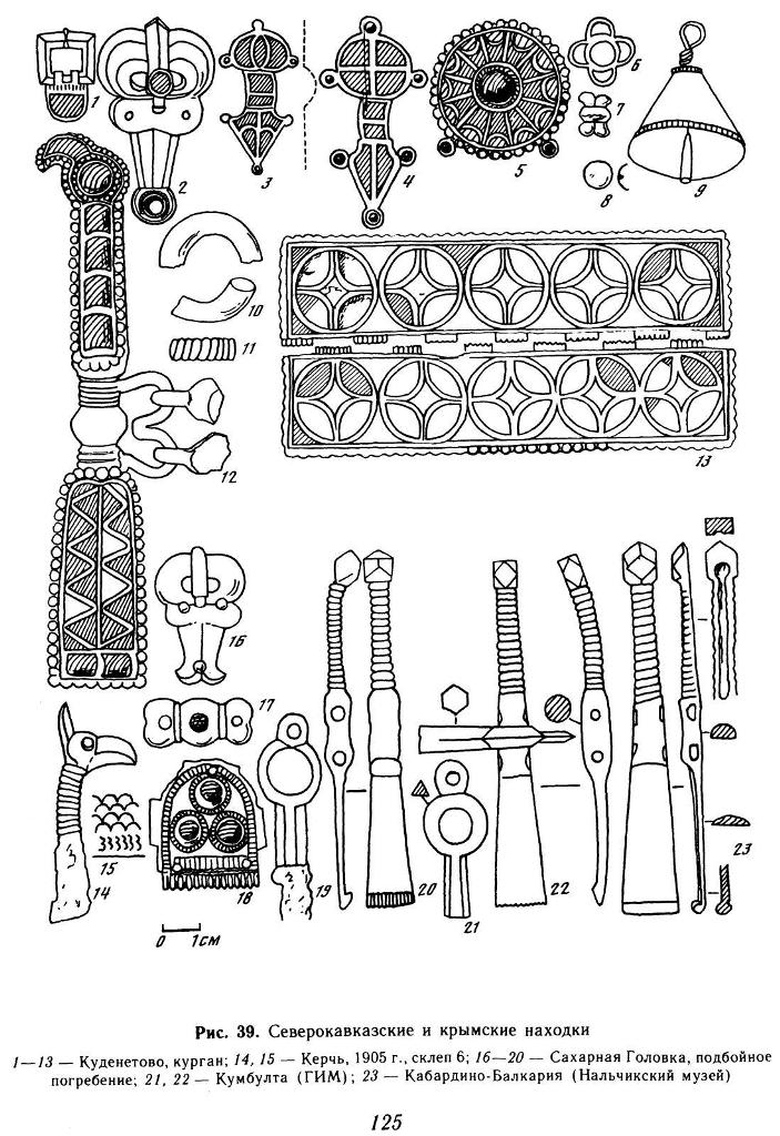 Рис. 39. Северокавказские и крымские находки. 1-13 - Куденетово, курган; 14, 15 — Керчь, 1905 г., склеп 6; 16-20 — Сахарная Головка, подбойное погребение; 21, 22 — Кумбулта (ГИМ); 23 — Кабардино-Балкария (Нальчикский музей).