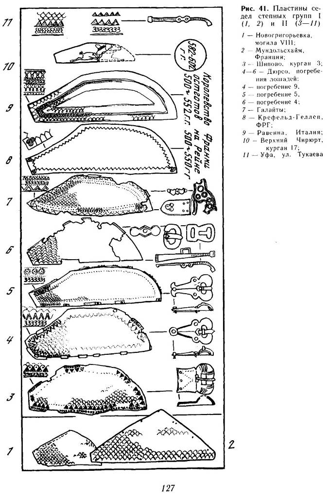 Рис. 41. Пластины сёдел степных групп I (1, 2) и II (3-11). 1 — Новогригорьевка, могила VIII; 2 — Мундольсхайм, Франция; — Шипово, курган 3; 4-6 — Дюрсо, погребения лошадей: — погребение 9, — погребение 5, — погребение 4; — Галайты; 8 — Крефельд-Геллеп, ФРГ; 9 — Равенна, Италия; 10 — Верхний Чирюрт, курган 17; 11 — Уфа, ул. Тукаева.