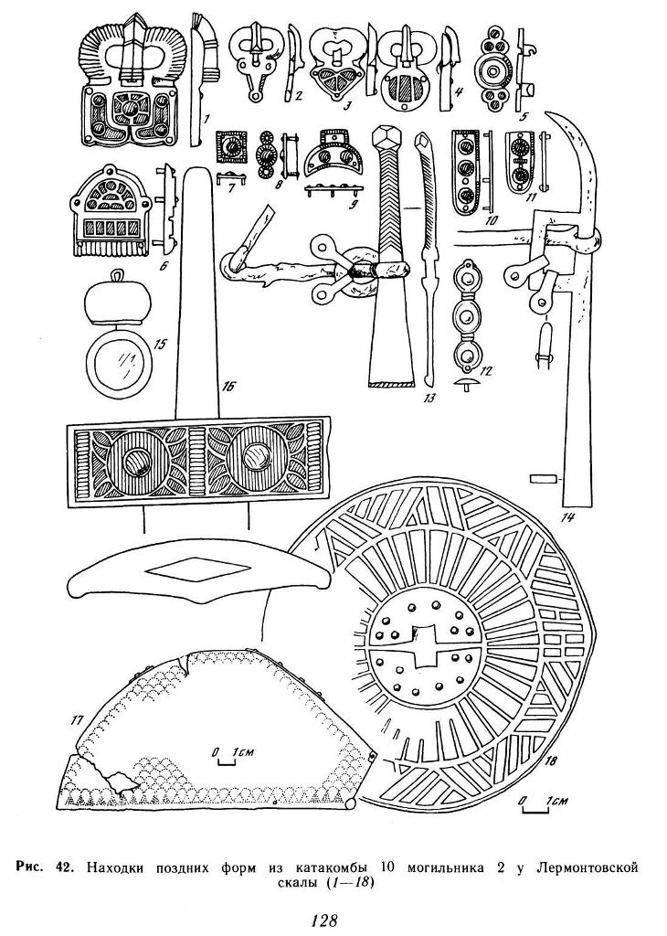 Рис. 42. Находки поздних форм из катакомбы 10 могильника 2 у Лермонтовской скалы (1-18).