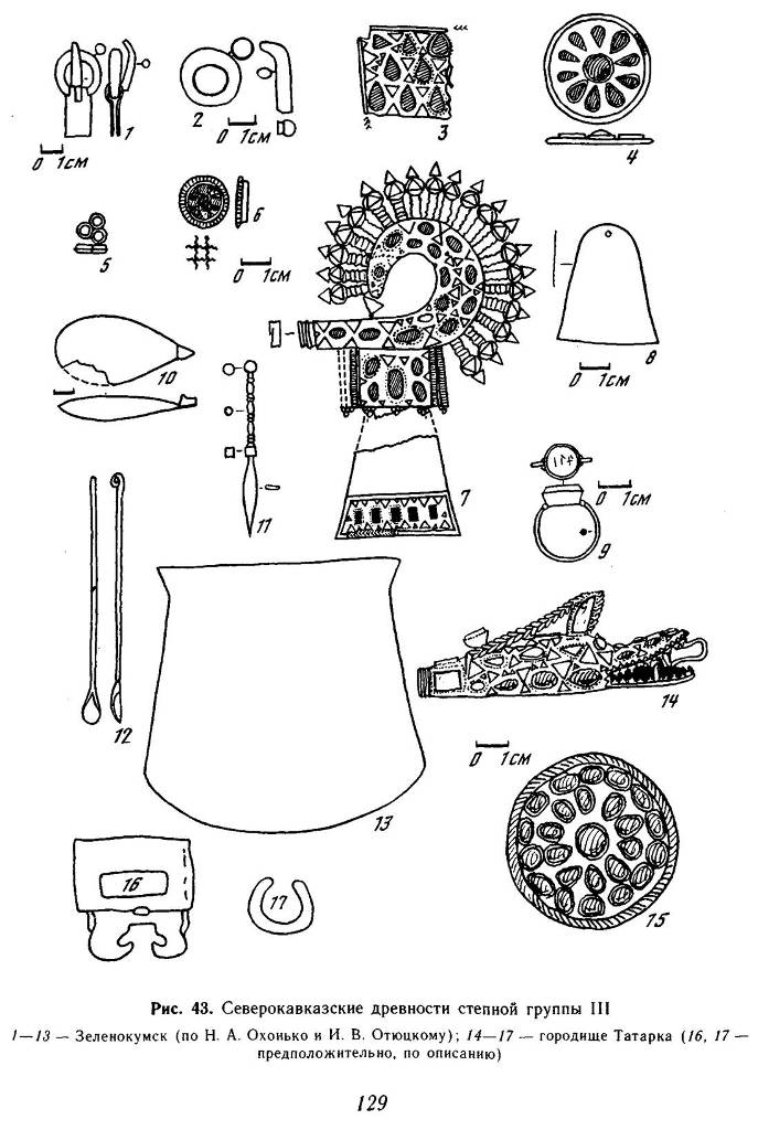 Рис. 43. Северокавказские древности степной группы III. 1-13 — Зеленокумск (по Н.А. Охонько и И.В. Отюцкому); 14-17 — городище Татарка (16, 17 — предположительно, по описанию).