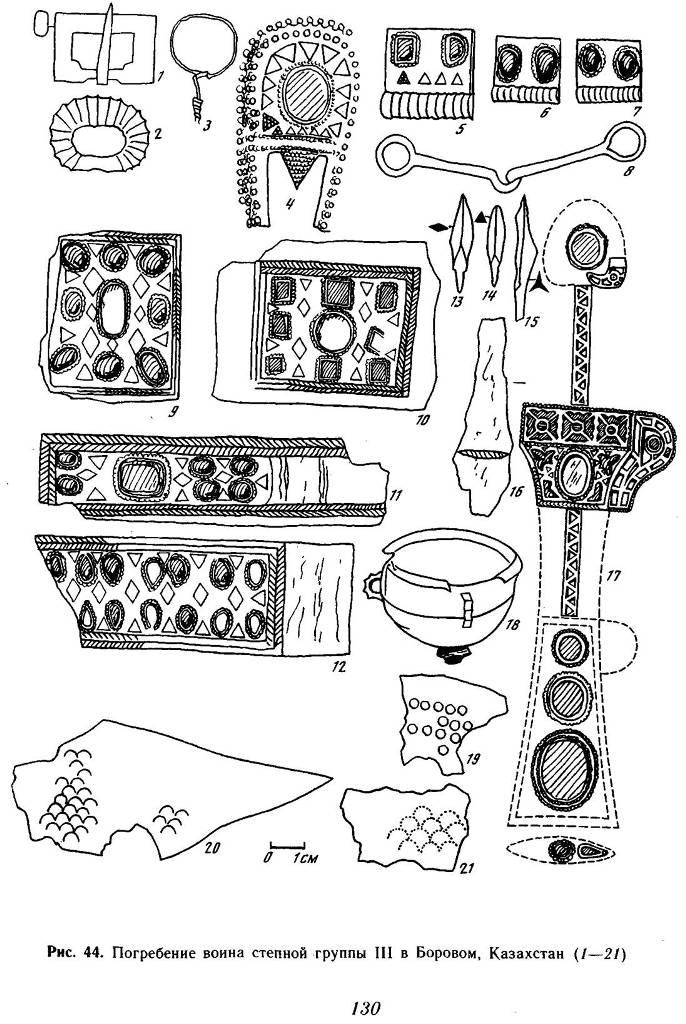 Рис. 44. Погребение воина степной группы III в Боровом, Казахстан (1-21).