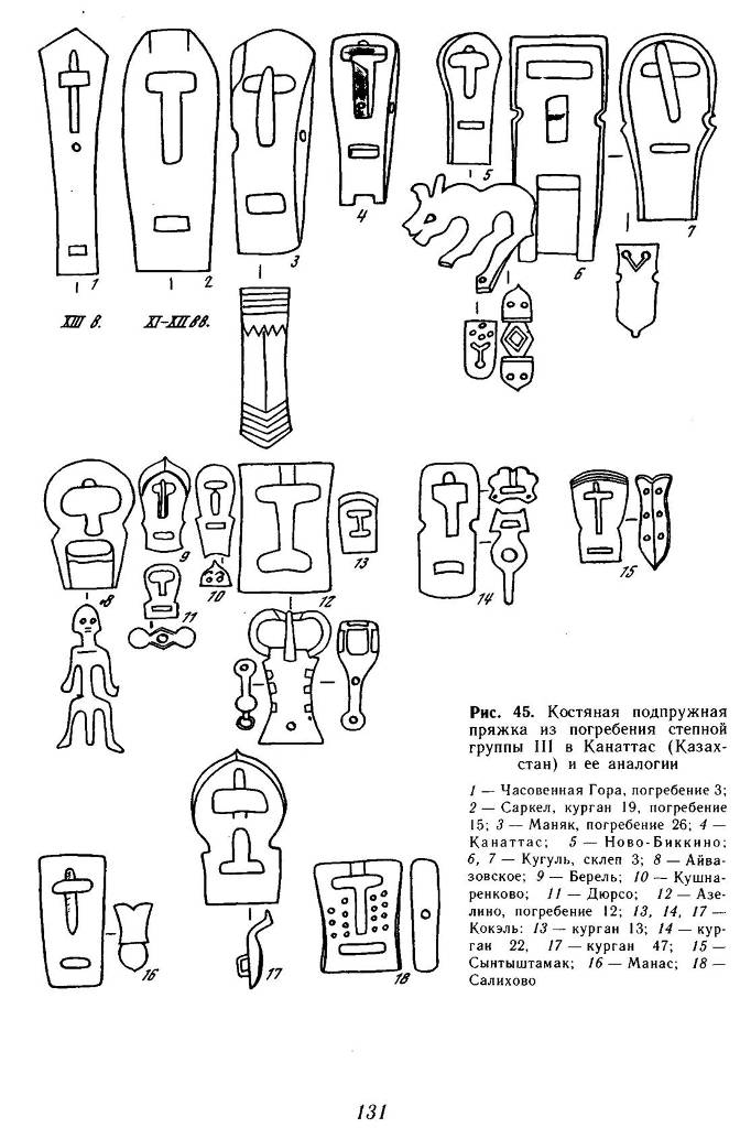 Рис. 45. Костяная подпружная пряжка из погребения степной группы III в Канаттас (Казахстан) и её аналогии. 1 — Часовенная Гора, погребение 3; 2 — Саркел, курган 19, погребение 15; 3 — Маняк, погребение 26; 4 — Канаттас; 5 — Ново-Биккино; 6, 7 — Кугуль, склеп 3; 8 — Айвазовское; 9 — Берель; 10 — Кушнаренково; 11 — Дюрсо; 12 — Азелино, погребение 12; 13, 14, 17 — Кокэль: 13 — курган 13; 14 — курган 22, 17 — курган 47; 15 — Сынтыштамак; 16 — Манас; 18 — Салихово.